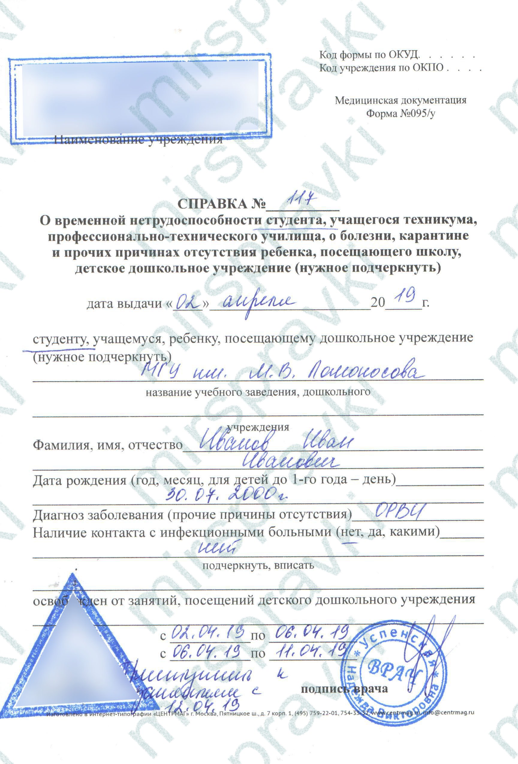 Медицинская справка 095/у — медицинский документ, подтверждающий временную нетрудоспособность и наличие болезни, согласно результатам врачебного осмотра у педиатра (для детей) или врача-терапевта. Срок лечения — до 10 дней, в случае дополнения документа дополнительными выписками/справками срок может быть продлен до 30 дней.